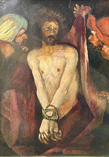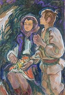 sygn. p.g.: Sich, na odwrocie nalepka z numerem 2101, autorem i tytułem: Stary Fedko ze swoimi wnuczkami, wskazująca, że pierwotnie obraz był częścią tryptyku. Stan zachowania: sfalowanie papieru.