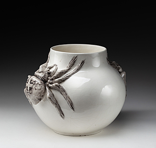 fajans (delikatny), jasna angoba, szkliwo przejrzyste ołowiowe (z krakelurą, niewielki odprysk na jednym z odnóży pająka); wys. 25,5 cm, szer. (z uchwytami) ok. 38 cm; średn. 30 cm;