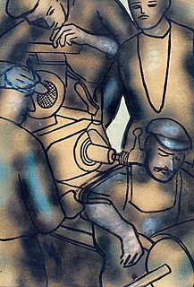 gwasz, tusz lawowany, technika własna, papier naklejony na karton; 37,5 x 35 cm;