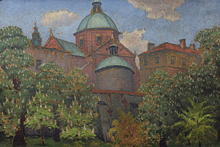 na odwrocie uszkodzona nalepka wystawowa z 1936 z tytułem obrazu: Kościółek w Dębnie; oraz nalepka z odręcznymi informacjami o obrazie.
