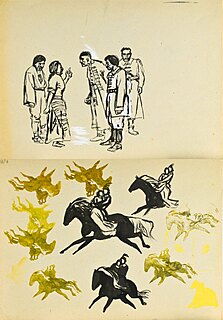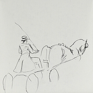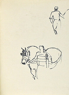 Na odwrocie rysunki pary na koniu w różnych ujęciach tuszem.