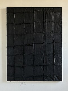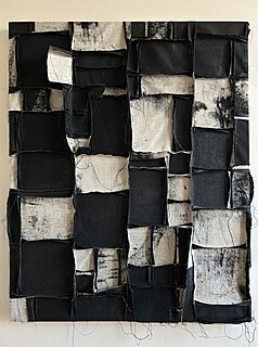 Technika własna: rama sosnowa o wymiarach 100x80 cm, kryta czarną farbą, płótno surówkowe o splocie skośnym, dwukrotnie malowane suchą czarną farbą akrylową, print, szpachelka, nić poliestrowa.