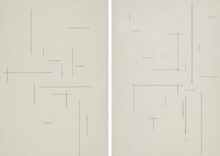 1. Line Composition I, 2014; maszyna do pisania, papier graficzny, płótno lniane; 17,5 x 12,5 cm; sygn., dat. i opisany na odwrocie oprawy: