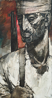 na odwrocie opis : AUT. MACIEJ LACHUR BIELSKO / TYTUŁ: RANNY PARTYZANT / TECH. OLEJ / WYM. 78 X 42 / NR. LEG. ZPAP 2436 / OKRĘG KATOWICE.