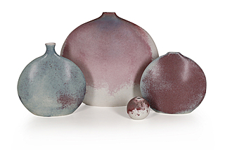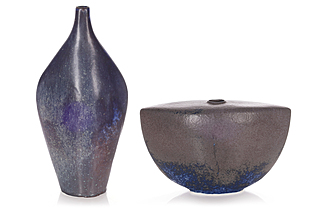 porcelana, autorskie szkliwo, wymiary mniejszego wazonu: wys. 14,5 cm, szerokość 15 cm, wymiary większego wazonu: wys. 24,5 cm, szerokość 14 cm,