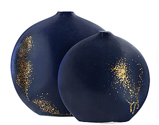 porcelana, autorskie szkliwo kryjące półmatowe, złocenia, wymiary mniejszego wazonu: wys. 26 cm, szerokość 25 cm, wymiary większego wazonu: wys. 31 cm, szerokość 32 cm,