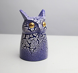 ceramika szkliwiona z efektem, złocone oczy, 12,5 x 7 x 7,5 cm. Od spodu logo autorki i studia, opis numeryczny: 15/2021.