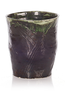 czarka fajansowa w kolorze szarym, o nieregularnym kształcie, glazurowna, wys. 10,5 cm; sygn. u spodu wycisk z monogramem autorki