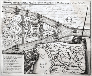 Plan twierdzy szwedzkiej w widłach Wisły Gdańskiej i Wisły Elbląskiej, pochodzący z dzieła "Theatrum Europaeum", wyd. Frankfurt nad Menem, ok. 1630 r.; miedzioryt, wym. 23,8 x 28,8 cm (odcisk płyty); delikatne zagniecenia