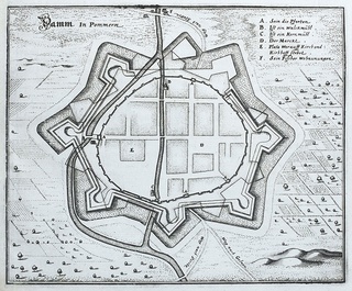 Plan umocnień Szczecina, rycina pochodząca z dzieła M. Zeillera " Topographia Electoratus Brandenburgici et Ducatus Pomeraniae...", wyd. Spadkobiercy M. Meriana, Frankfurt nad Menem, 1652 r.; miedzioryt, wym. 26,4 x 36 cm...