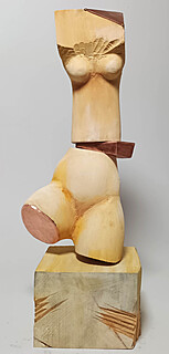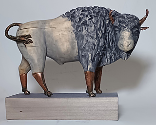 drewno, miedź, ok. 37 x 14 x 11 cm, sygnatura na rzeźbie: Mihran 2025
