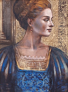 sygnowany l.g.: '[monogram M] | MIRA | 2025' oraz opisany na odwrocie: 'RENESANSOWA SUKIENKA | 40 x 30 cm, OLEJ, 2025 | MIRA SKOCZEK-WOJNICKA | Mira'25'