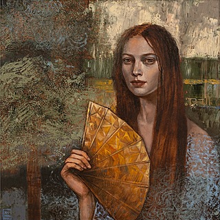 olej, płótno, 60 x 60 cm (w oprawie 79,7 x 79,5 cm), opisany na odwrocie: '"KOBIETA Z WACHLARZEM" | 60 x 60 cm, olej, 2022 | Mira Skoczek-Wojnicka | Mira'22'