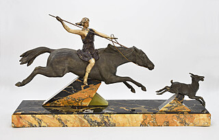 kompozycja metali brązowiona, polichromowana, marmur, onyks; wys. 35 cm; dł. 62 cm; głęb. 14 cm.