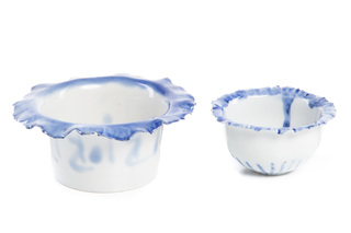 porcelana szkliwiona, ręcznie malowana chlorkiem kobaltu; wymiary: wys. 6,5 cm, śr. 15 cm oraz wys. 5,5 cm, śr. 10 cm