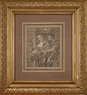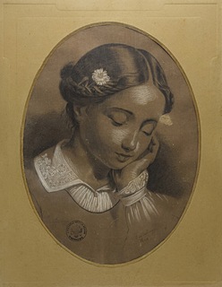 ołówek, biała kredka, szary papier; 39 x 29 cm (w świetle owalnej oprawy);