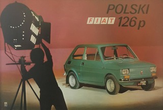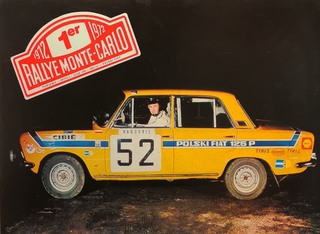 Plakat z przedstawieniem samochodu fiat 125P, którym w 1972 r. Robert Mucha i Lech Jaworowicz brali udział w słynnym wyścigu w Monte Carlo.