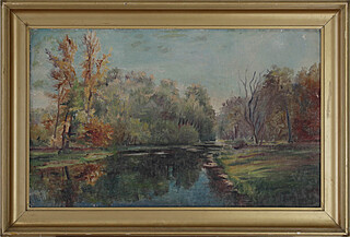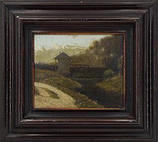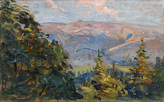 na odwrocie zarys kompozycji pejzażowej - górskiej w technice olejnej.