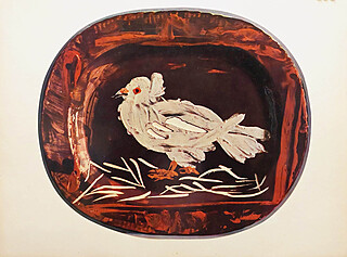 przedstawia reprodukcję ceramicznego talerza „Colombe sur lit de paille” (Gołąb na posłaniu ze słomy) autorstwa Pabla Picassa