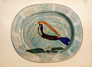 przedstawia reprodukcję ceramicznego talerza ''Oiseau sur un rocher'' (Ptak na skale) autorstwa Pabla Picassa