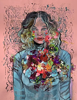 akryl, kolaż (sztuczne kwiaty), płótno, 50 x 50 cm,