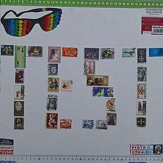 frotaż, akryl, spray, wlepki, płótno, 85x50 cm,