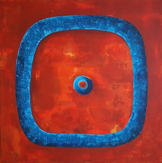 opisany na odwrocie: ‘M. Lamoro 2018 r. „Niebieski, różowy, czerwony” z cyklu: Figura czy kształt? 73 x 100 cm’