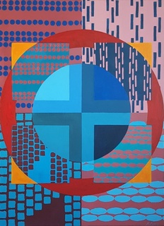 opis. na odwrociu: ‘M. Lamoro 2018 r. „Niebieski, różowy, czerwony” z cyklu: Figura czy kształt? 73 x 100 cm’
