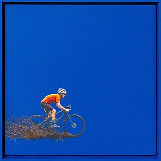Deska z ramką typu american boxWymiar 32 x 32 cmUnikatowy obraz przedstawiający samotnego rowerzystę na tle intensywnego błękitu.