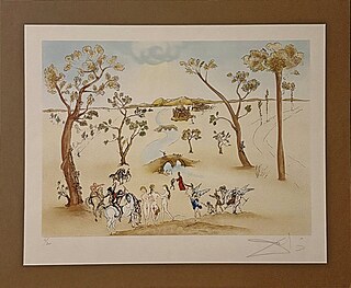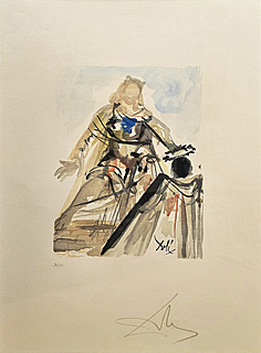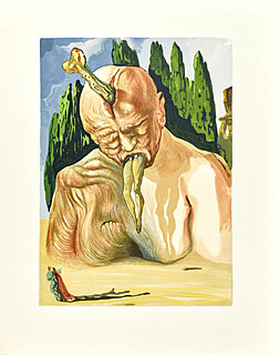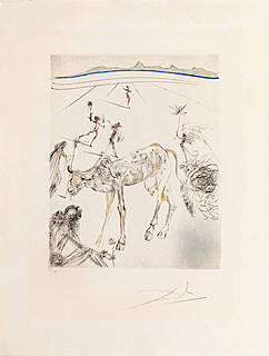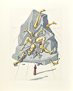 Akwaforta barwna, papier Magnani di Pescia 47 x 32 cm; sygn. na płycie l.g. „Dali”; arkusz posiada oryginalną bibułę ochronną z napisem „TAVOLA V” (tablica V); każda tablica cyklu jest przypisana do konkretnego rozdziału...