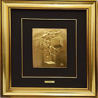 Relief (płaskorzeźba), laminat pokryty galwanicznie srebrem i złotem o próbach odpowiednio 1000/1000.