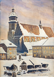 na odwrocie naklejka wystawowa TPSP w Krakowie z tytułem Baszta Krawiecka