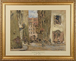Akwarela, papier, 34 x 24 cm w świetle oprawy, oprawiona w złotą ramę 40 x 49 cm.