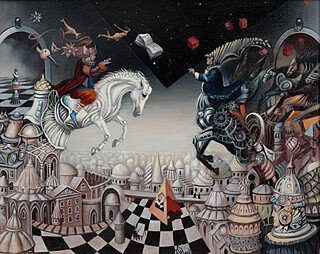 sygnowany u dołu: "T. Sętowski" i opisany na odwrocie: "Pojedynek na najwyższym poziomie | olej, płótno 40 x 50 cm | Tomek Sętowski"