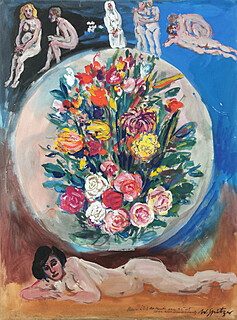 gwasz, papier, w kompozycje wpleciony wycięte elementy tapety z deseniem kwiatowym; 46 x 64 cm (w świetle passe-partout);