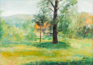 nalepka wystawowa z 1936 z opisem pracy i numerem 38915; nalepka z odręcznym napisem: Aneri, Pejzażysta olej.; nalepka wystawowa...