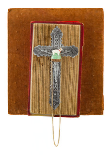 tektura, papier zadrukowany, szkło (szyba 3 mm, stopka kieliszka, fragment znicza), papierowe ozdoby trumienne, folia srebrna, nadpalona świeczka, drewno;