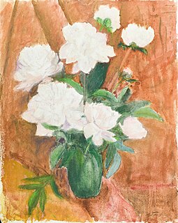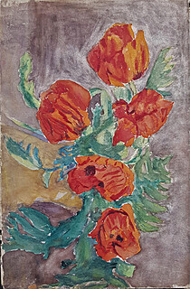 Na odwrocie Róże w niebieskim wazonie na ciemnym tle w technice akwarelowej.