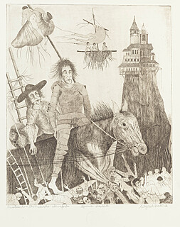sygn. p.d.: Wojciech Kostiuk, opisana l.d.: Szaleństwo Don Kichota akwaforta