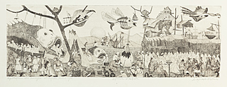 akwaforta, sucha igła, papier, 21 x 60 cm, E/A