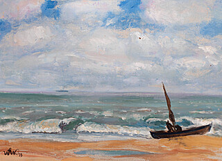 na odwrocie nalepka z opisem: Wojciech Weiss |”Wyjazd na połów”|(olej)