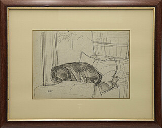 na odwrocie dwa studia głowy psa rysowane węglem; w lewym górnym rogu przy krawędzi nr 001443 i stempel z faksymile artysty WWeiss.