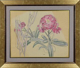 na odwrocie rysunek węglem kwitnącej rośliny i doklejona karteczka z owalnym stemplem z napisem wokół: ZE ZBIORU DZIEŁ WOJCIECHA WEISSA. DOM ARTYSTY z faksymile...