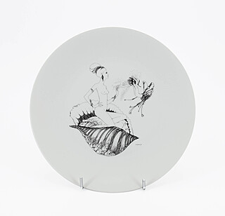 porcelana biała szkliwiona; średnica ok. 23 cm; sygn. z prawej strony w lustrze: SIUDMAK 71; na spodzie oznaczenia: nr egzemplarza (23), znak wytwórni (czerwienią żelaza); opis...