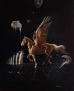 sygnowany p. d.: "W. Siudmak" i opisany na odwrocie: "W. SIUDMAK | PARIS | "ZŁOTY PEGAZ" | PEGAZE D'OR | 55 X 76 cm | 1990 | huile, olej, vernis huilo"