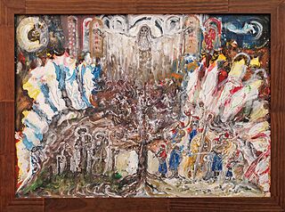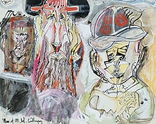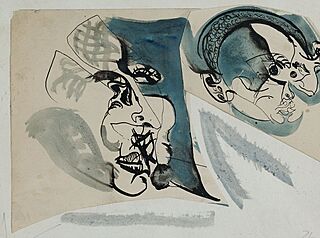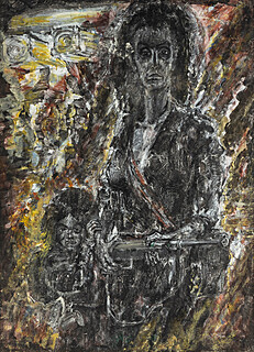 Olej, tusz, piórko, sklejka; 55 x 76 cm