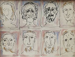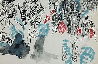 Tusz, ołówek, gwasz, papier; 35 x 50 cm