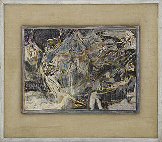 na odwrocie napis: Zdzisław Lachur / 1963 / technika tempera / metal (częściowo olej) / pierwsza kompozycja / na temat ,,Pejzaż z ludźmi".