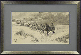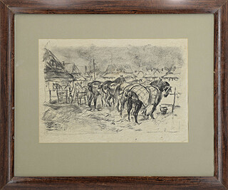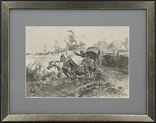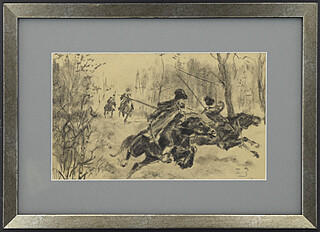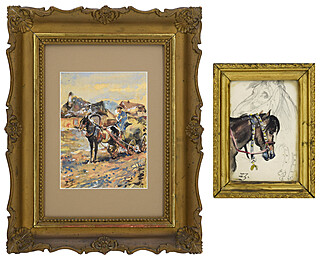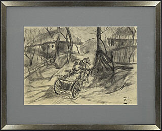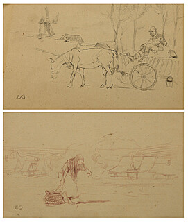 Na odwrocie ołówkowe szkice koni i powozów