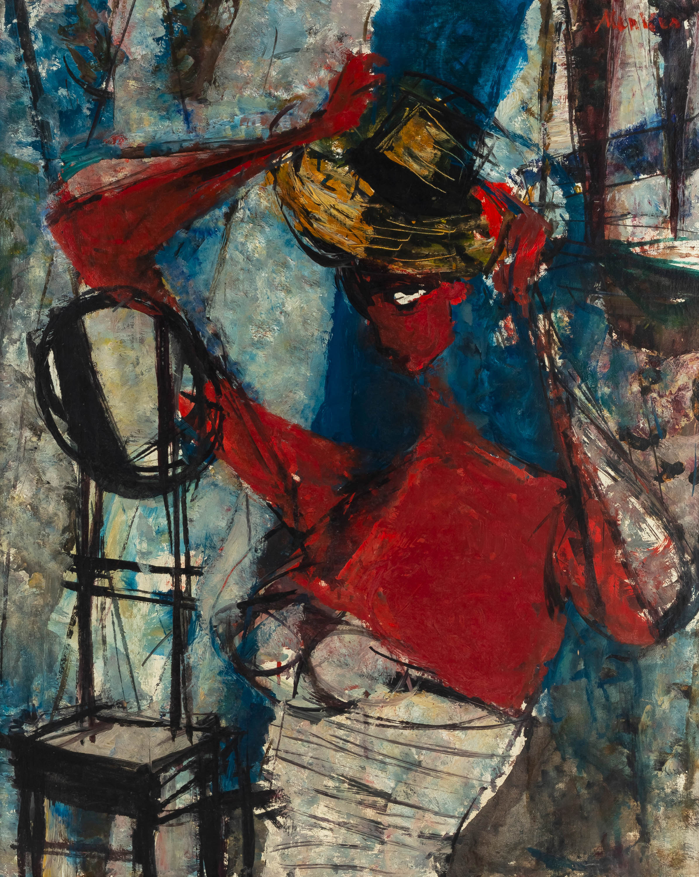 olej, płótno, 81,5 x 66,5 cm, sygn. p.g.: Menkes na odwrocie pracy, w lewym górnym rogu ramy tabliczka (galeryjna?): ARTIST Sigmunt Menkes / TITLE In the looking Glass / MEDIUM oil / [COLL]ECTION RIGHTS FOR TITLE / ART [...] //.